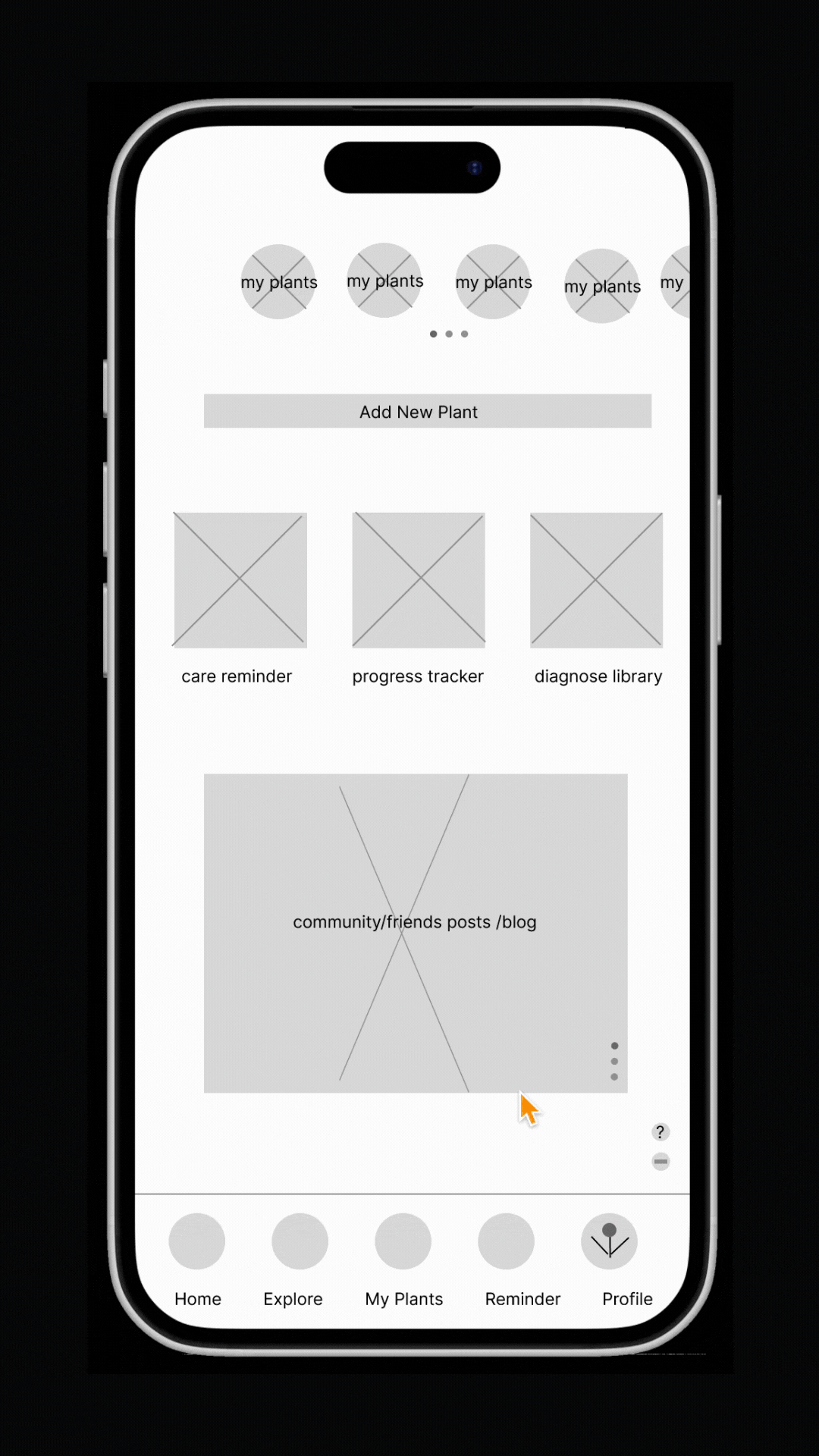 Most important and easily accessible based on user persona’s need for plant app. Reminders for plants in order, progress tracker with most recent, and library to diagnose or of diagnosed plants
